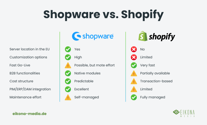 Der Wartungsaufwand korreliert stark mit der Individualität. Immer wenn Du etwas abseits des Standards in eine Software einbaust, kostet das bei Updates und Wartung Geld. Bei Shopware benötigst Du dafür einen Dienstleister, EIKONA Media steht Dir hier gerne zur Seite. Einen einfachen Shop ohne viele Produkte und großen Umsatz, kannst Du mit Shopify auch selbst betreiben.