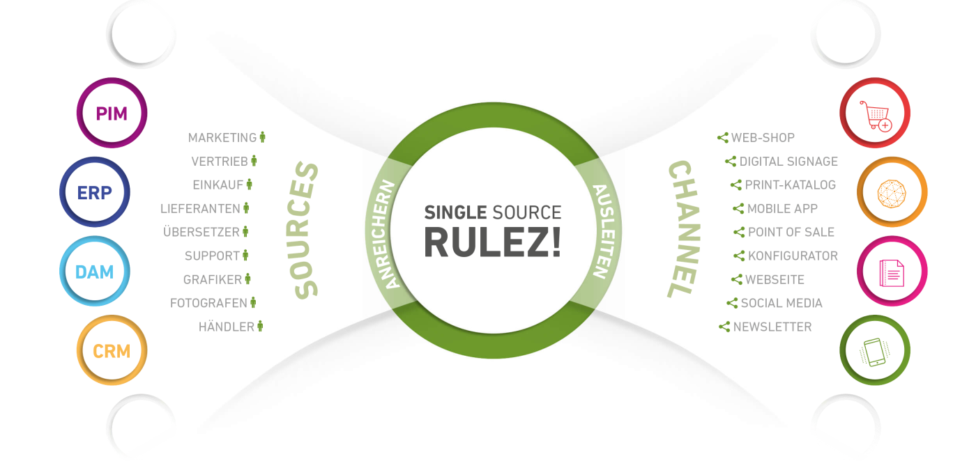 Eine Produktinformation wird einmal gespeichert und zentral gepflegt. Von dort werden die Daten automatisiert in verschiedene Kanäle, wie Web-Shop oder Print-Katalog ausgeleitet. Diese Art des Informations-Managements bildet die Grundlage unserer Multichannel-Strategie.