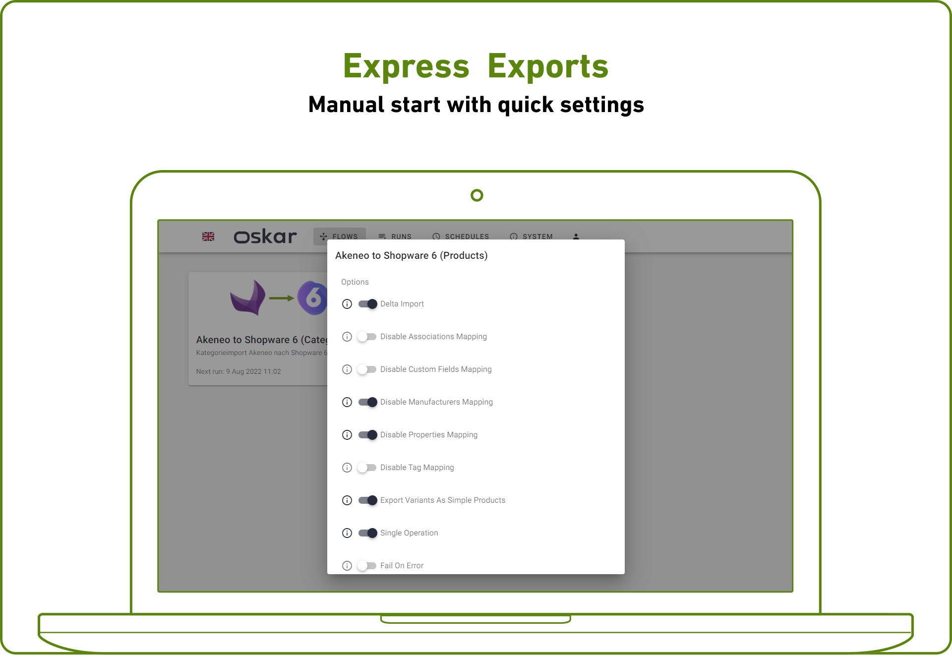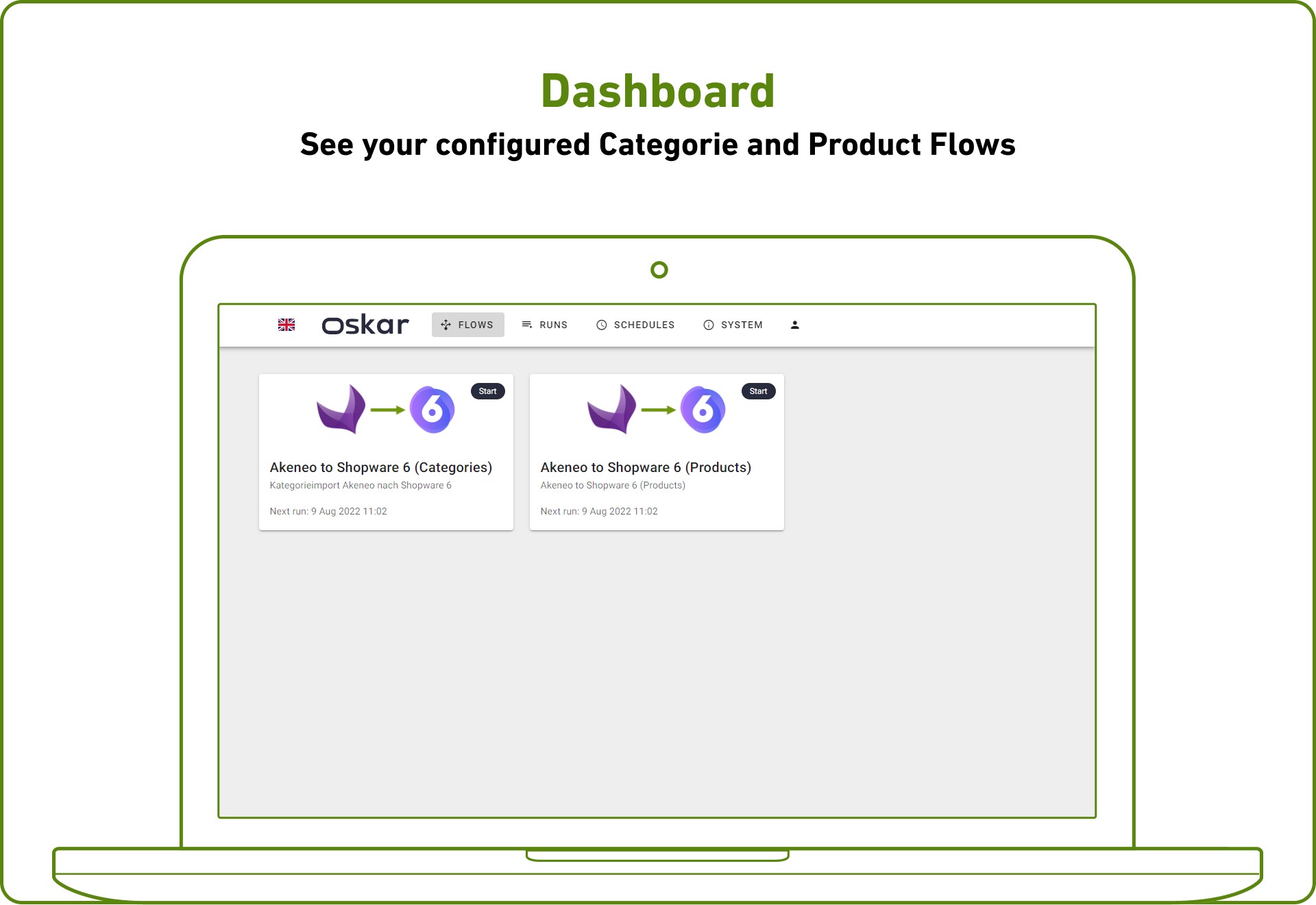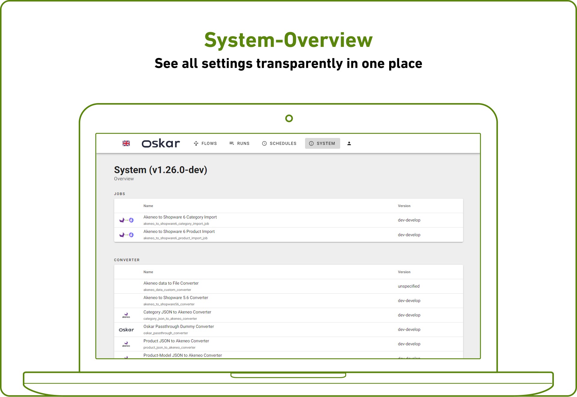 Our connector runs on the Oskar MIDDLEWARE and is connected via interfaces with Akeneo, and shopware. For this reason, he is with all the Akeneo versions 2.x (EE/CE) and higher compatible. On the shop side, we support the store merchandise editions 5 and 6. Oscar is an E-Commerce Framework that allows you to manage your data flows in an intelligent way. There are a variety of tools to connect, conversion and control of your System landscape and your individual data and processes. There are Full - and Delta-exports to shop goods possible.