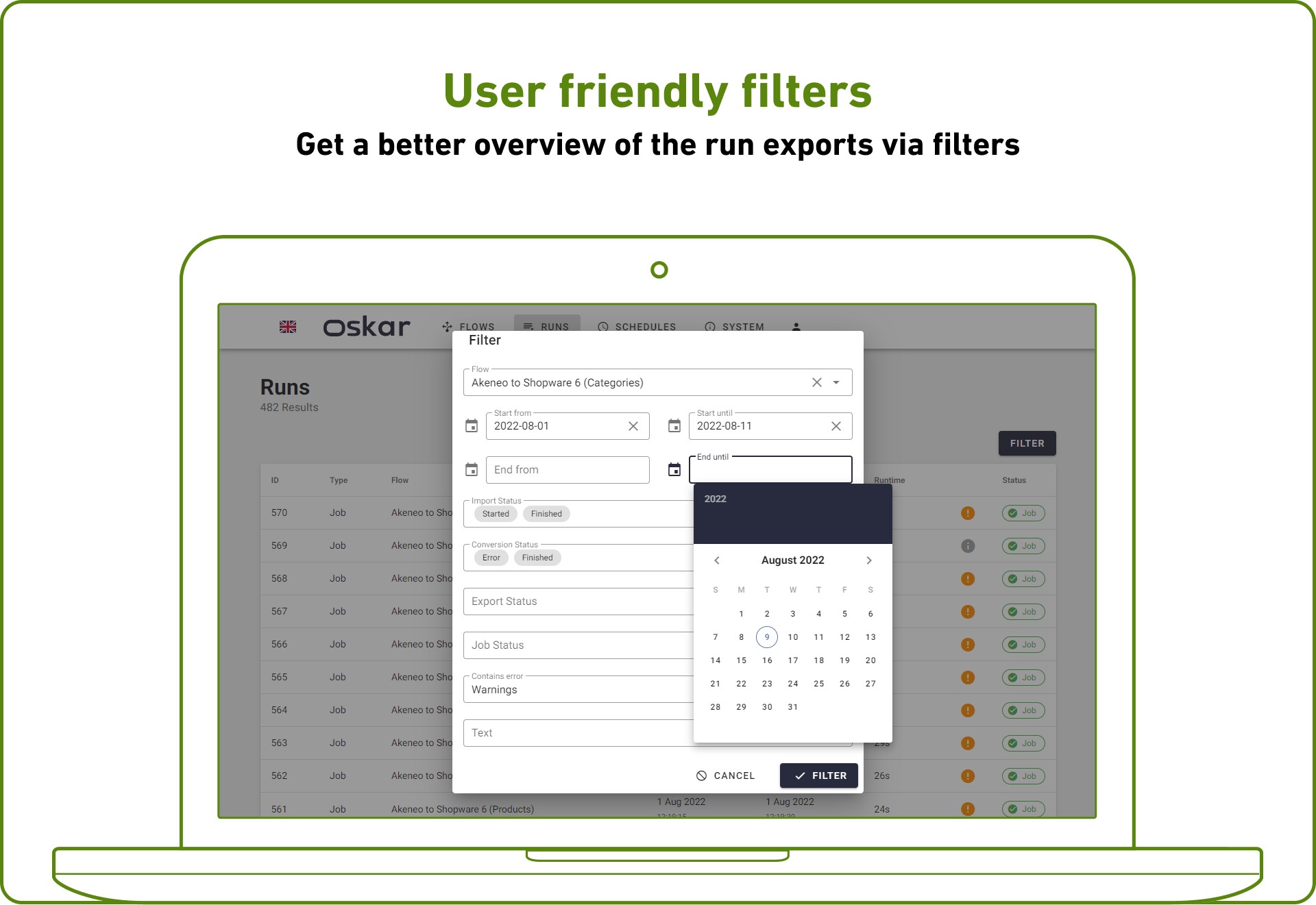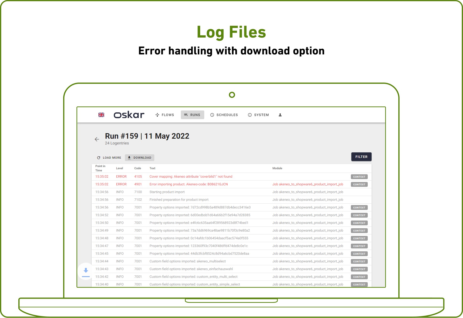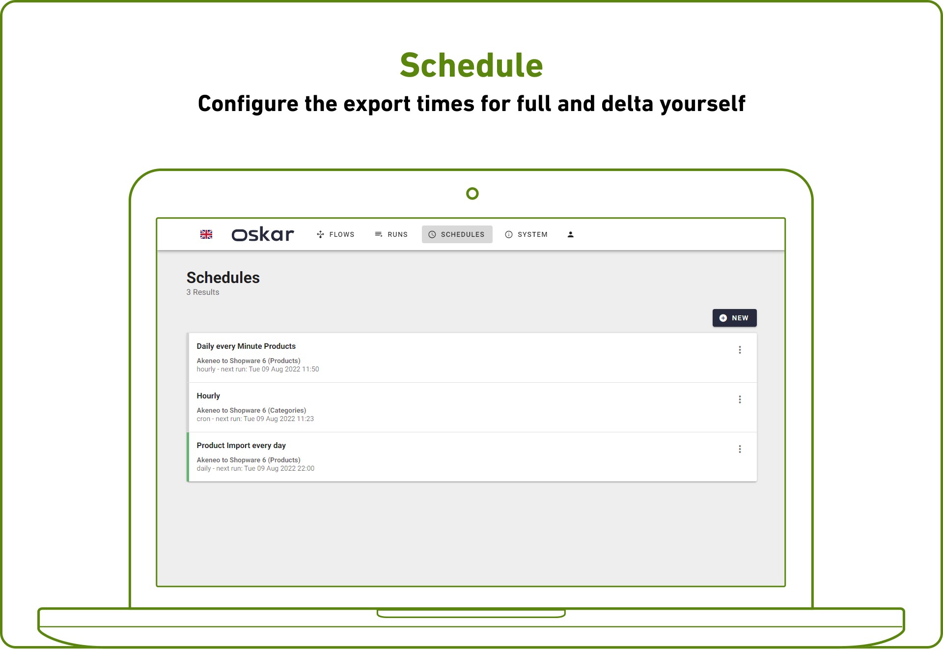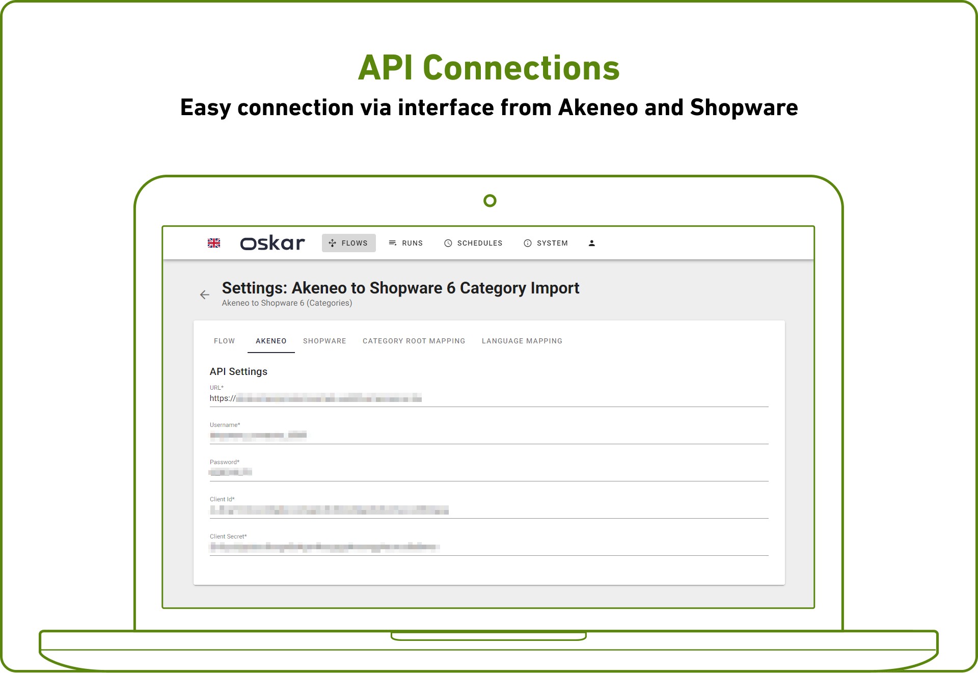 Our connector runs on the Oskar MIDDLEWARE and is connected via interfaces with Akeneo, and shopware. For this reason, he is with all the Akeneo versions 2.x (EE/CE) and higher compatible. On the shop side, we support the store merchandise editions 5 and 6. Oscar is an E-Commerce Framework that allows you to manage your data flows in an intelligent way. There are a variety of tools to connect, conversion and control of your System landscape and your individual data and processes. There are Full - and Delta-exports to shop goods possible.
