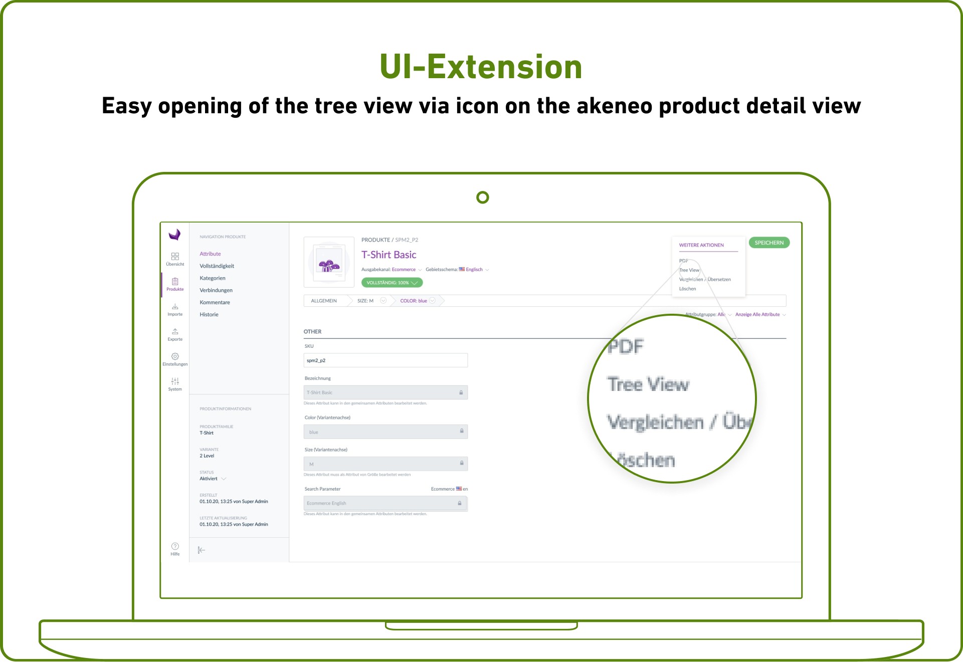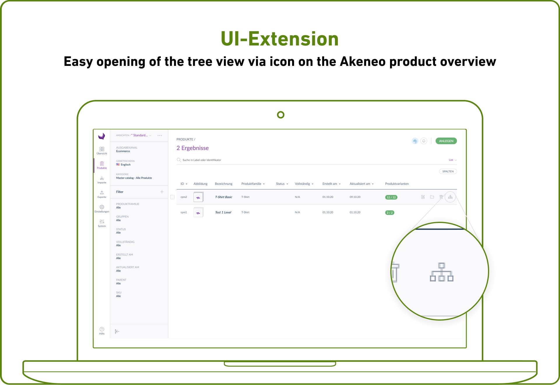 The Akeneo interface is enhanced with our Tree View icon in appropriate places.